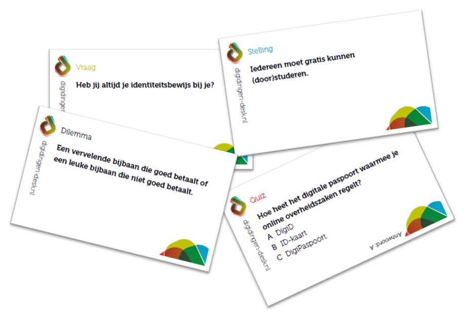 De kletskaarten ‘Digitale regelzaken’ van Digidingen-desk zijn vernieuwd én uitgebreid. De inhoud is geactualiseerd, de set is aangevuld met extra kaarten en de koppeling met de verschillende thema’s van Digidingen-desk is versterkt. Daarmee is de bestaande gesprekstool verder doorontwikkeld voor professionals die met jongeren werken, zoals bibliotheekmedewerkers, docenten, mentoren en jongerenwerkers.